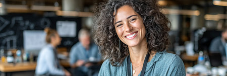 Joyful professional woman in an open office setting, embodying a modern and vibrant work lifestyle.