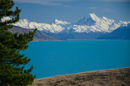 Distant view of Mount Cook across Lake Pukaki with tree on the left, South Island, New Zealand