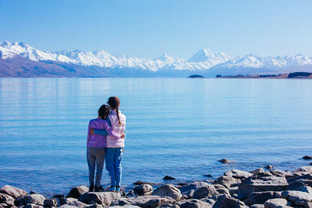 Beautiful view of the bluish Pukaki Lake with snowy Mount Cook in the background, New Zealand
