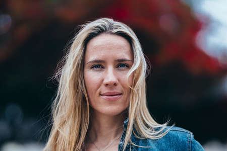 close-up of a blonde caucasian woman with blue eyes