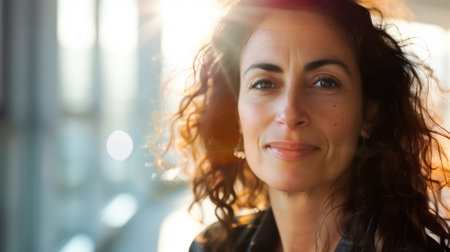 A youthful woman radiating joy with her warm smile and sun-kissed hair, capturing a moment of happiness in soft golden evening light. An inspiring image of positivity.