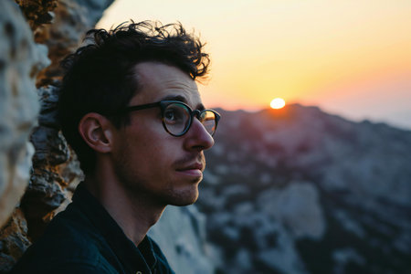 Portrait of a handsome young man with glasses on the background of the sunset.