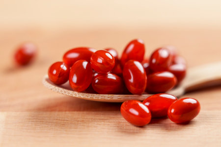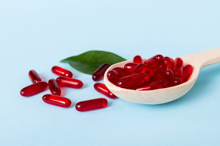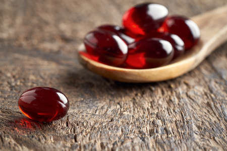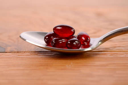Vitamin capsules in a spoon on a colored background. Pills served as a healthy meal. Red soft gel vitamin supplement capsules on spoon.