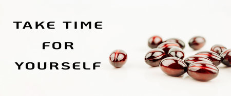 Red capsules are scattered across a clean white surface, accompanied by an inspiring phrase about self-care, highlighting the importance of health and personal well-being