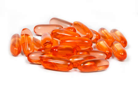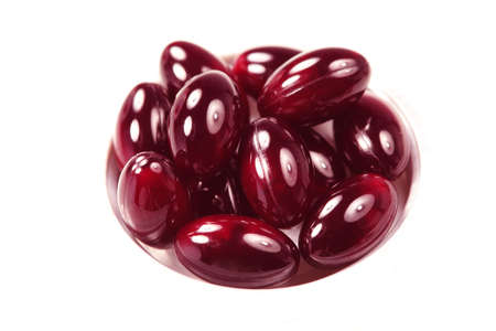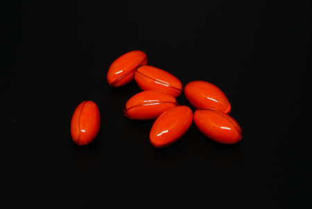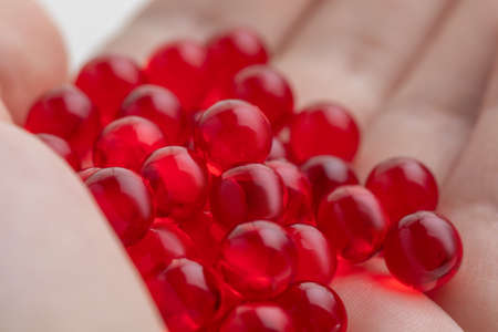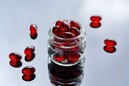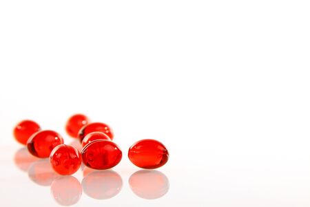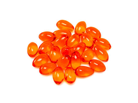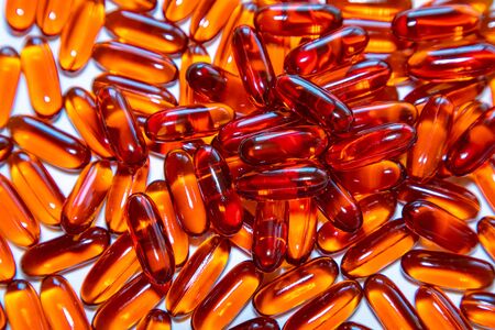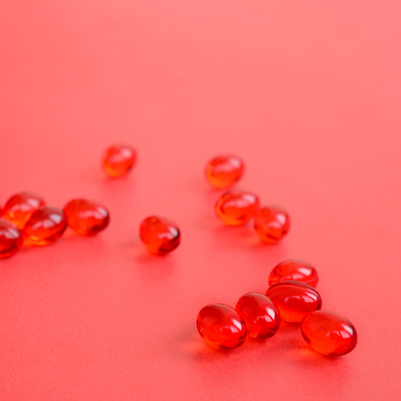 Red soft gel capsule pills isolated on white background. Pile of red soft capsule. Vitamins and dietary supplements concept. Pharmaceutical industry. Pharmacy drug store. Health care products.