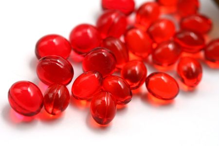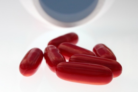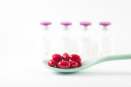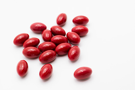 Selective focus, group of red medical pills isolated on white background.Health and medicine concept