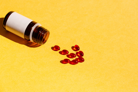 Red pills spilled around a pill bottle. Medicines and prescription pills flat lay background. Red medical capsules.