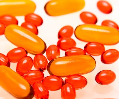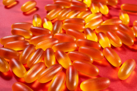 lots of yellow gelatin capsules on a red background. omega viramins, close-up, macro