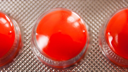 Close-up view of red transparent capsules on a concrete table, focusing on their glossy finish and vivid color, creating an inviting visual