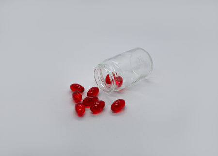 Jars of red pills. Tablets poured out of the jar on white background. Glass brown pill bottle