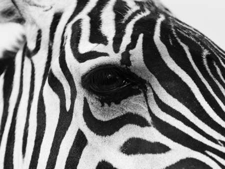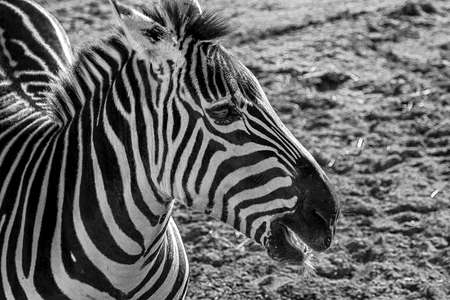 Portrait of a Zebra, in black and white, close-up, beautiful and well-groomed animal.