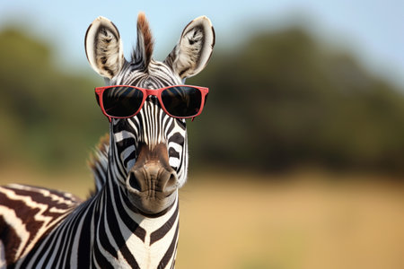 Stylish zebra wearing red sunglasses on a sunny savannah