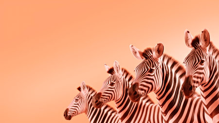 A group of zebras standing next to each other, on peach fuzz background.