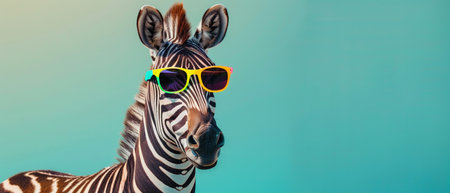 A zebra looks fashion-forward in multicolored sunglasses against a soft teal background.