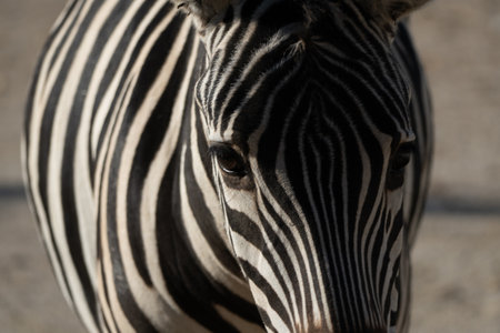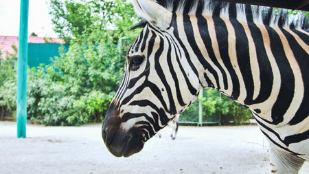 Zebras Stripes Closeup Zoo Animal: Detailed portrait of a zebra at a zoo, showcasing its distinctive stripes. Daytime observation for educational purposes.