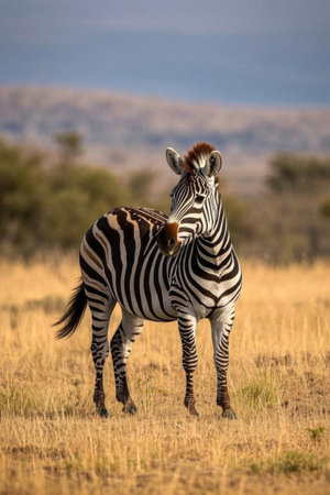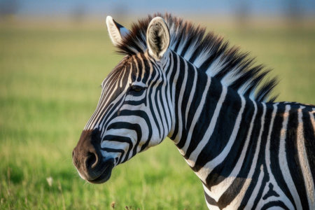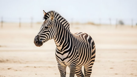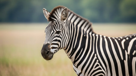 A zebra stands in a field with blurred background, showcasing black and white stripes. The composition features soft lighting with a shallow depth of field, highlighting the animal. Potential uses include wildlife documentaries, educational materials, and stock photography for nature-related projects.