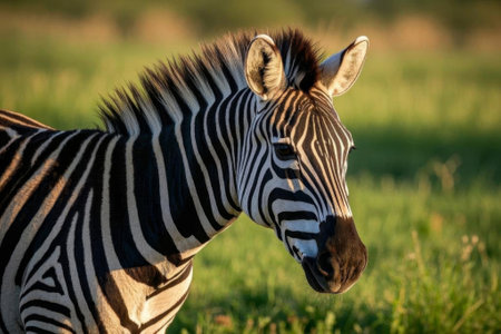 Zebra in sunlit african savanna with lush greenery at sunrise.
