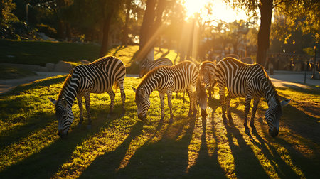 A peaceful scene of zebras grazing in a park during sunset showcasing nature's beauty.