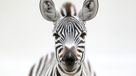 A zebra stands confidently showcasing its distinctive stripes in a stunning black and white contrast. The animal gazes directly at the viewer.