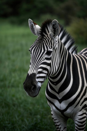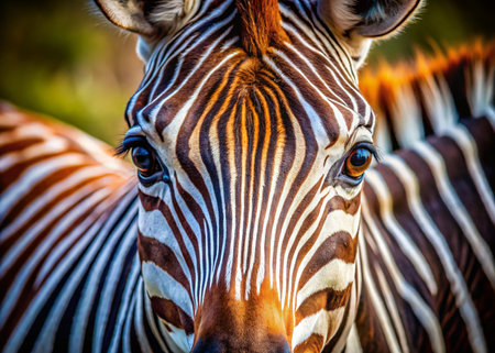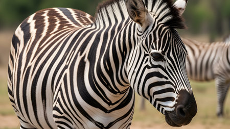 This stunning close-up photograph features a zebra showcasing its unique black and white stripes. Set in a serene natural habitat, this majestic animal highlights the beauty of wildlife in its tranquil environment.