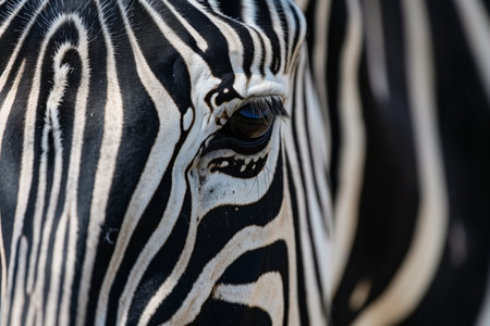 This photograph presents a detailed portrait of a zebra, highlighting its iconic black and white striped pattern. The image displays natural lighting and a shallow depth of field, emphasizing the animal's head and eye. This versatile image may be suitable for diverse commercial applications, encompassing editorial and illustrative needs.