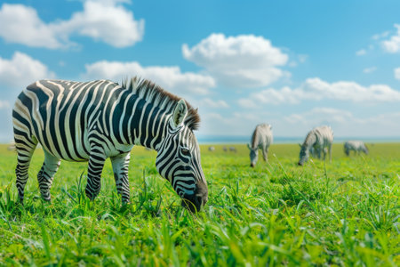 A small herd of zebras grazing on lush green grasslands under a bright blue sky, showcasing their black-and-white stripes.. AI generated.