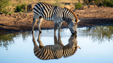 A breathtaking image of a zebra drinking from a tranquil pond, showcasing its striking stripes and reflection. This scene captures the essence of wildlife in its natural habitat.