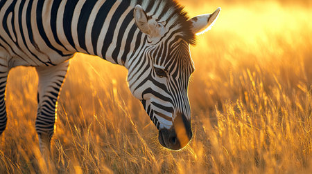 Experience the beauty of a zebra grazing gracefully in golden grass under the warm light of the setting sun in the African savannah, highlighting nature's elegance.