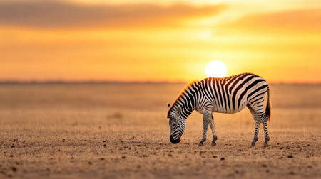 A zebra grazing in vast landscape during stunning sunset