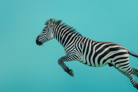 Captivating image of a whimsical zebra superhero midflight against a bright turquoise background, symbolizing freedom and power