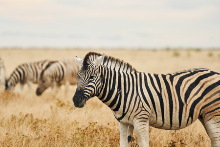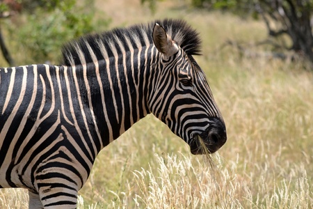 Wild african life. Close up Namibian mountain zebra in the middle of the savannah.