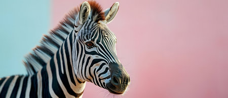 Zebra on a pink and blue background. Close up.