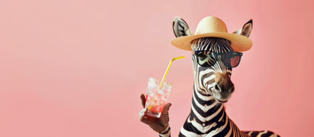 Funny zebra in summer hat and sunglasses holding a glass with juice. Summer vacation concept.