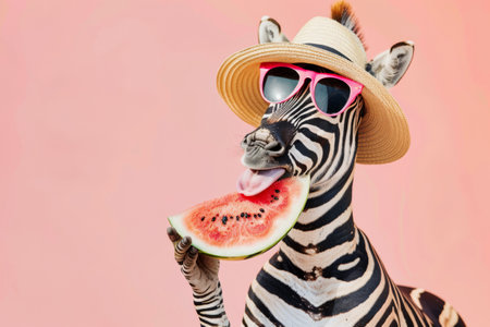 Funny zebra in a hat and sunglasses eating watermelon, on a pink background. Creative concept for summer vacation and weekend.