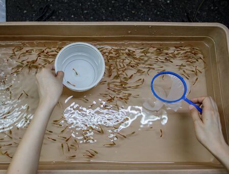 Someone Trying To Catch Some Small Fish with Net from a Container