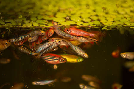 Beautiful freshwater fish belonging to the tetras family in an aquarium planted with elodea