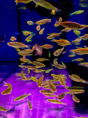 Colorful tropical fish swimming in a bright blue water aquarium. Concept of underwater world, marine life, aquatic creatures, exotic species. Copy space. Background. Banner.