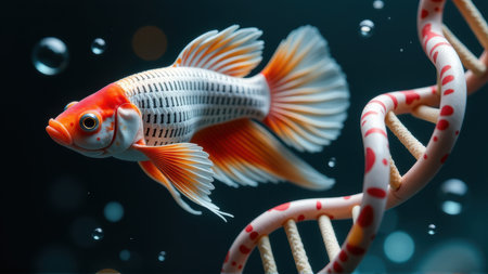 Vibrant fish swims among school in water, surrounded by floating particles, creating calm and mesmerizing underwater moment