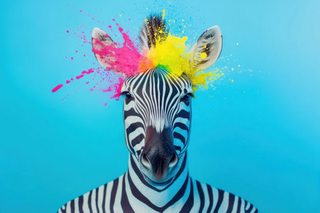 Zebra showing colorful holi painting splashing on its head