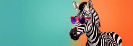 Stylish zebra wearing fashionable pink sunglasses poses against a vibrant teal and orange split background, creating a striking visual with ample copy space for text or design elements