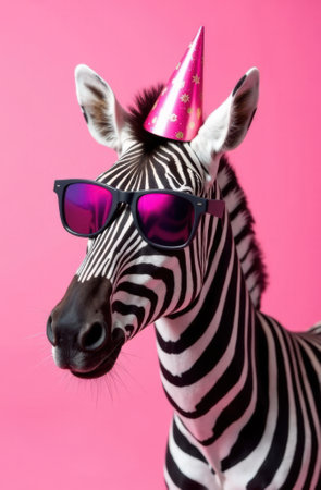 Quirky zebra sporting pink sunglasses and a festive party hat, celebrating joyfully against a vibrant pink backdrop, radiating a fun and playful atmosphere perfect for any celebration