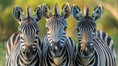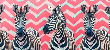 Three zebras posing on trendy geometric background