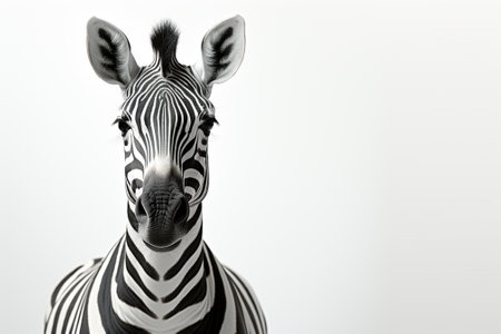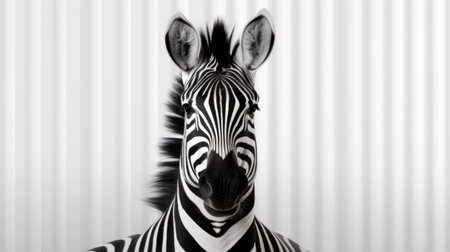 a zebra, captured by mark seliger, stands against a white background in a surrealistic installation style. the horizontal stripes of the zebra's body are accentuated by the soft focus lens, drawing attention to its facial expression. this thought-provoking image carries political symbolism and can be found on flickr. ai generated