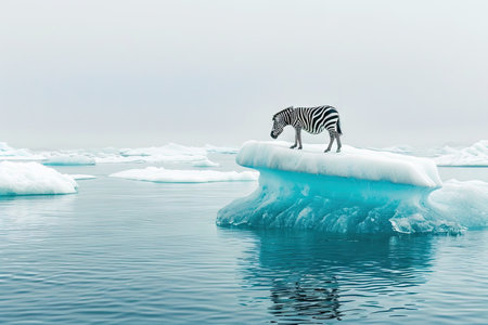 An African zebra on a floating iceberg in the middle of the ocean
