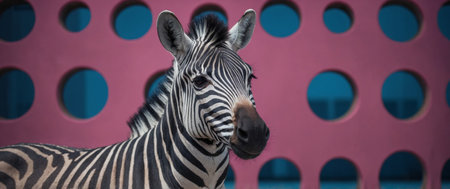 Zebra on a pink and blue background. Close up.