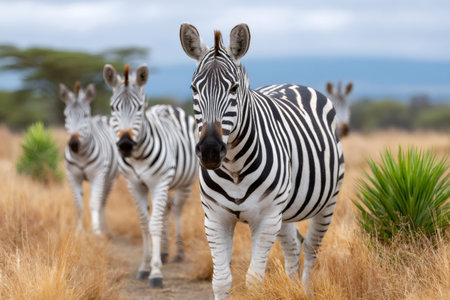 Group of zebras walking in line in the African savanna