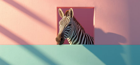 a zebra peeking out of a blue and pink wall.