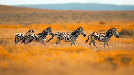 A stunning scene of a herd of zebras moving through golden grasslands under a bright sky, capturing the essence of wildlife and natural beauty in serene surroundings.