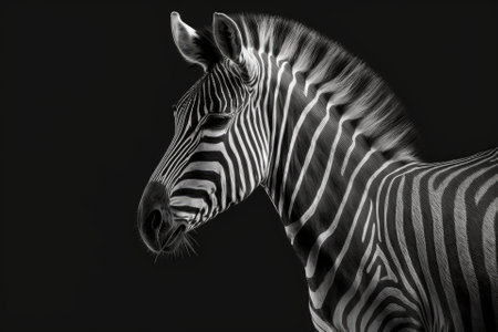 One zebra on a black background, seen from the side. Black and white art photography, striped animal pattern, african wild nature monochrome wallpaper, copy space. Generative AI