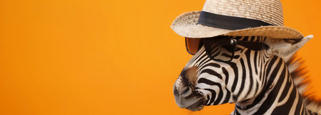 Zebra wearing sunglasses and hat, orange background, wildlife adventures with copy space.
